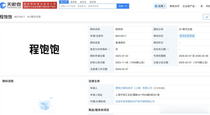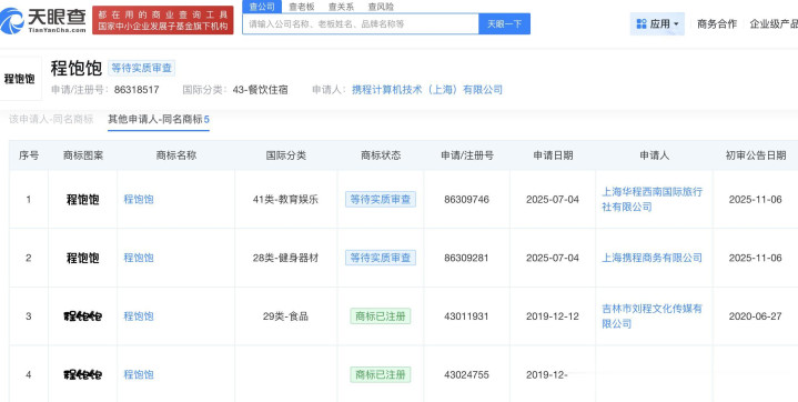 天眼查App显示,携程目前正在申请“熊猫主厨程饱饱 CHENG BAOBAO”、“TRIPPAW程饱饱”、“程饱饱”等多个商标。