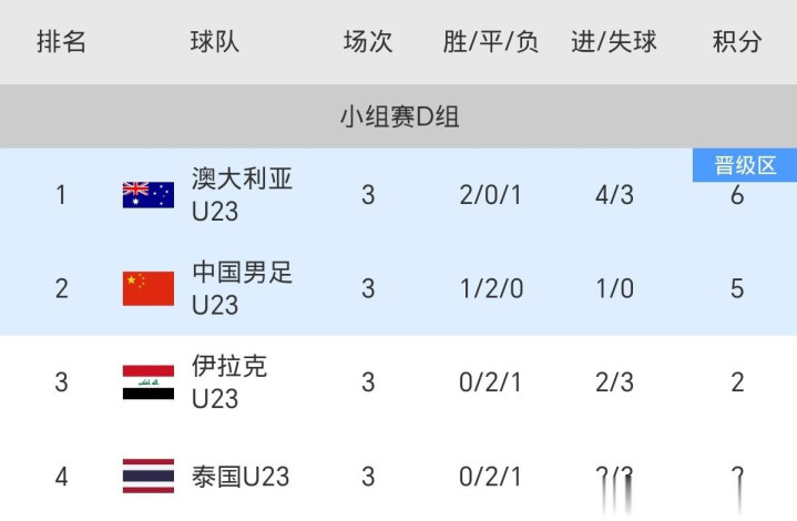 D组最终积分榜上,澳大利亚积6分升至第1,中国一胜两平积5分,排名第2出线;伊拉克与泰国饮恨出局!