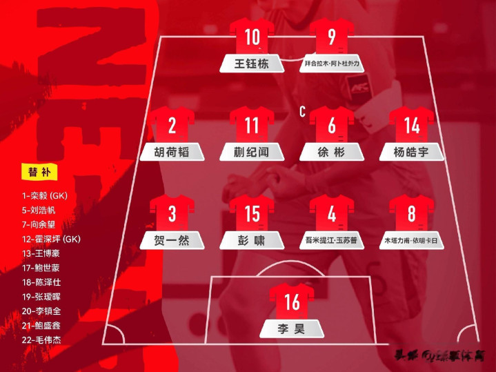 李昊、胡荷韬、贺一然、吾米提江、彭啸、徐彬、杨皓宇(46'李镇全)、木塔力甫(46'张瑷辉)、拜合拉木(71'向余望)、王钰栋(80'陈泽仕)、蒯纪闻(62'王博豪)